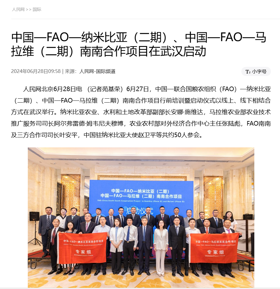 人民網:中國—FAO—納米比亞(二期)、中國—FAO—馬拉維(二期)南南合作項目在武漢啟動